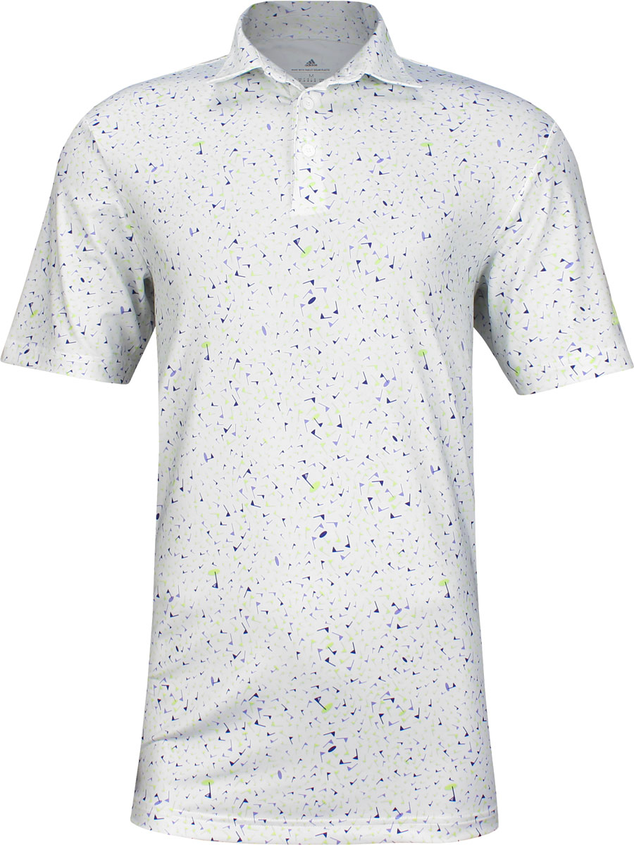 Adidas Primeblue Flag Print golf shirts are made up of 88% Recycled Polyester and 12% Spandex, a 3-button placket, and a self collar.