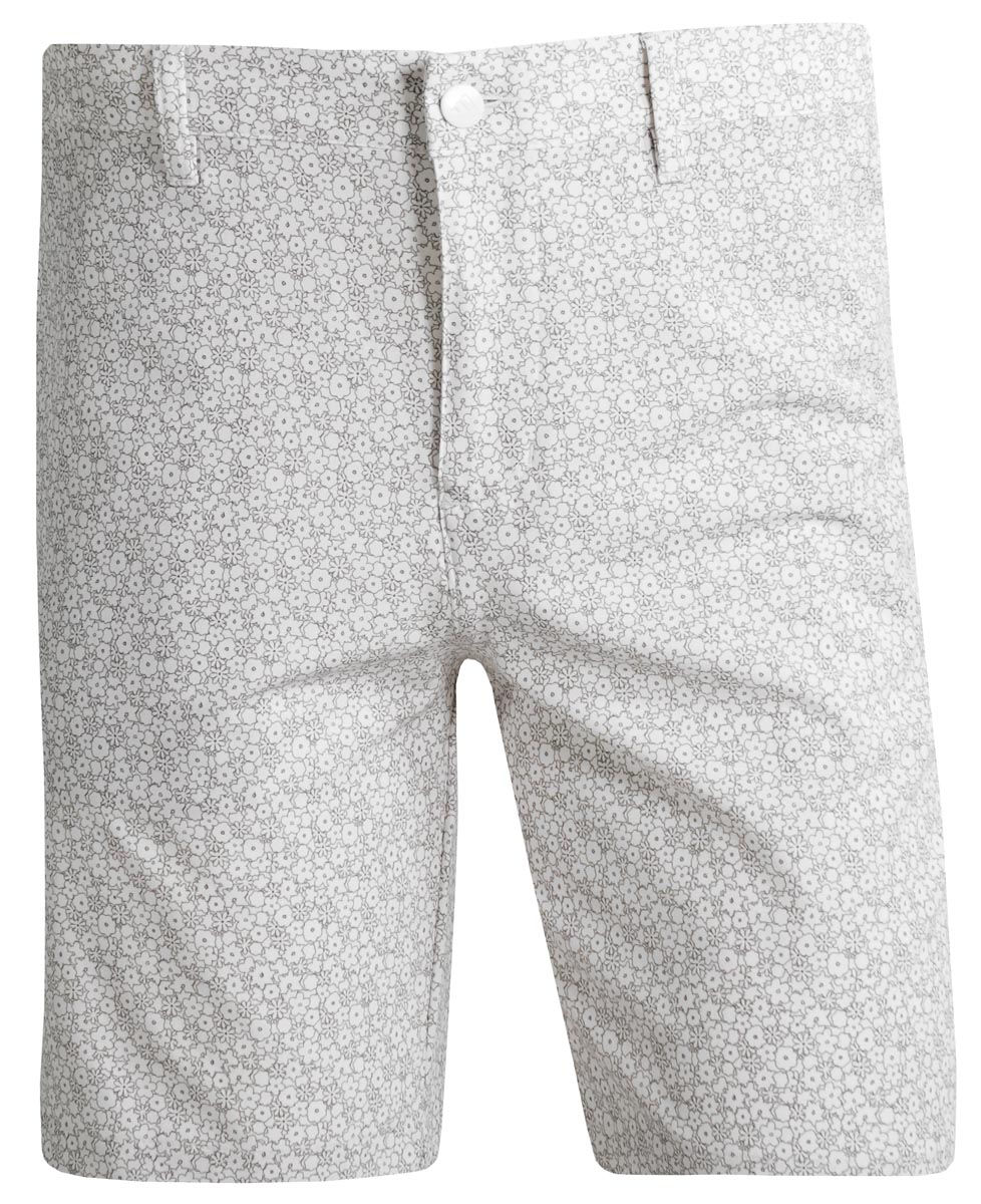 Adidas Ultimate 365 Printed 9" Golf Shorts are constructed with 88% Recycled Polyester, 12% Spandex, two front pocket, two back pockets, gripper tape inside the waist, and a subtle floral print.