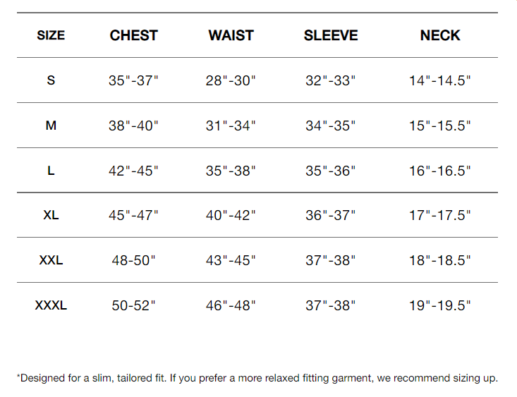 Below are the fitting guidelines for men's tops as outlined by G/FORE. All measurements are in inches.