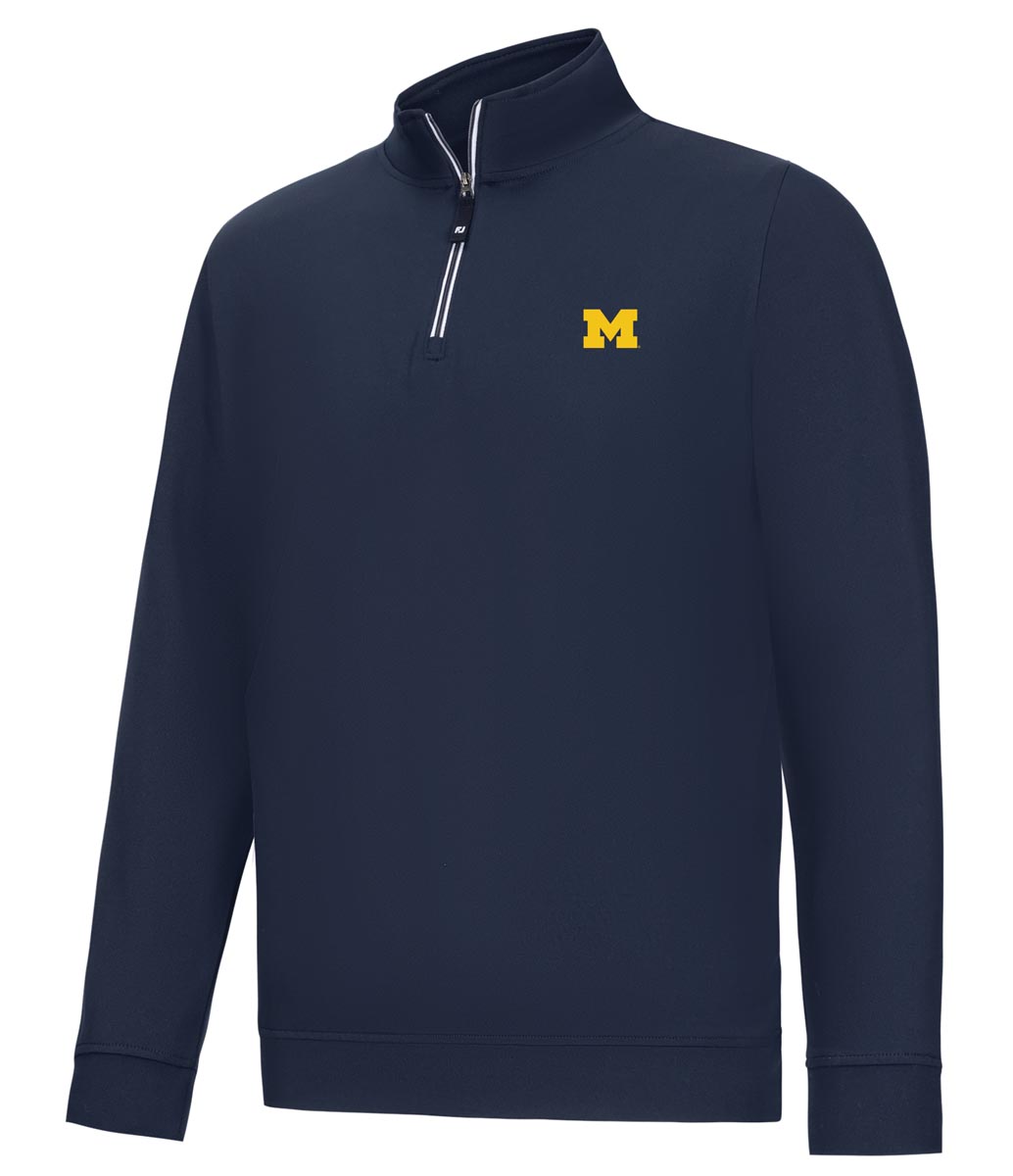 FootJoy Approach Quarter-Zip Golf Pullovers are constructed with 91% polyester, 9% Spandex, a pullover design with a quarter-zip opening, and the University of Michigan logo.