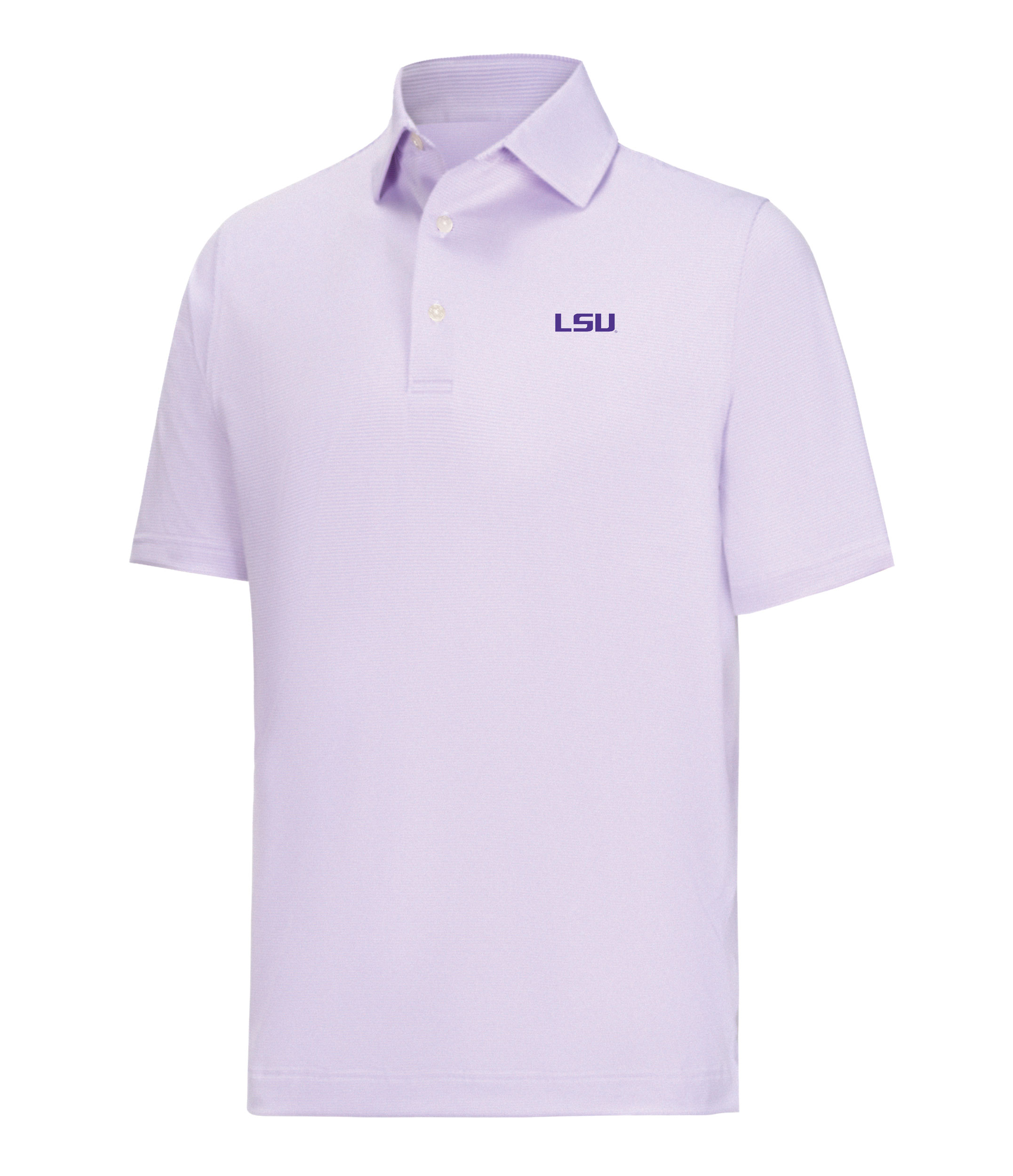 FootJoy MicroFeeder Performance Golf Shirts are constructed with 88% Polyester, 12% Elastane, a microfeeder stripe design, a 3-button placket, and the Louisiana State University logo.