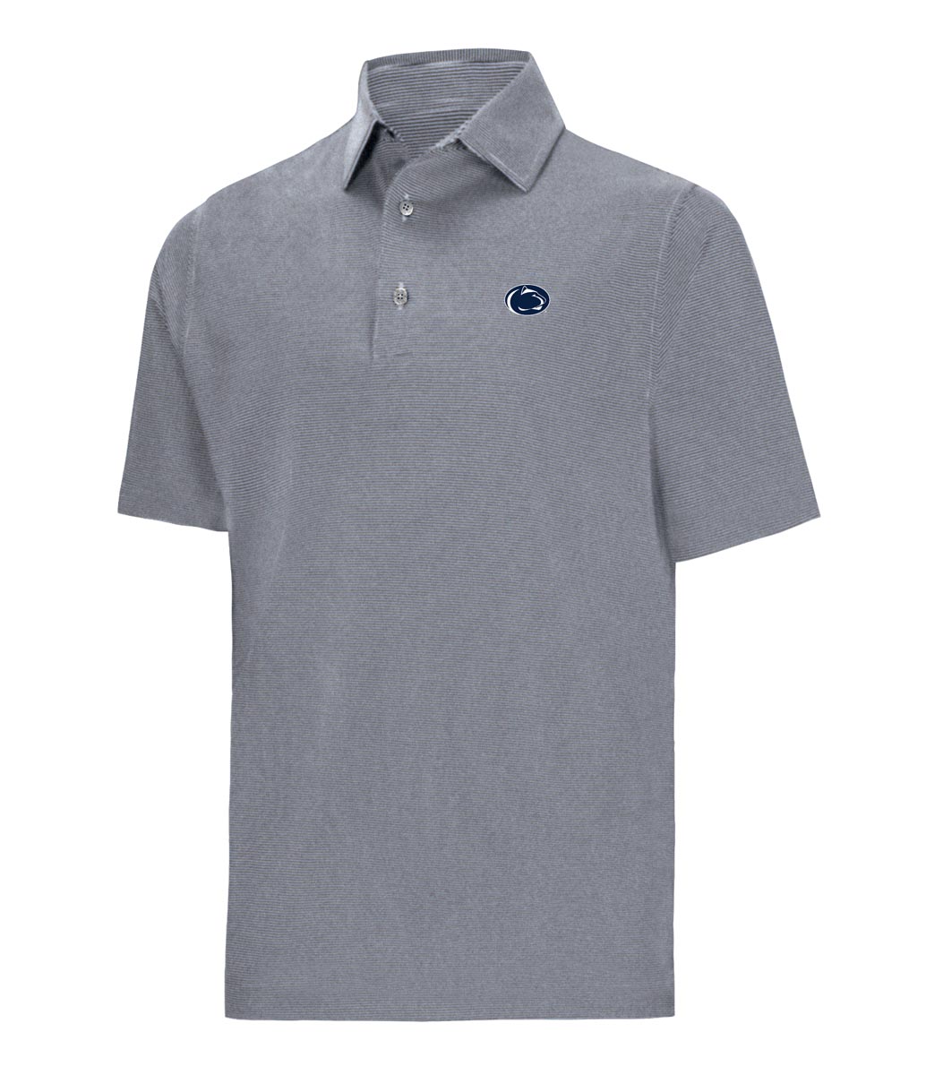 FootJoy MicroFeeder Performance Golf Shirts are constructed with 88% Polyester, 12% Elastane, a microfeeder stripe design, a 3-button placket, and the Penn State University logo.