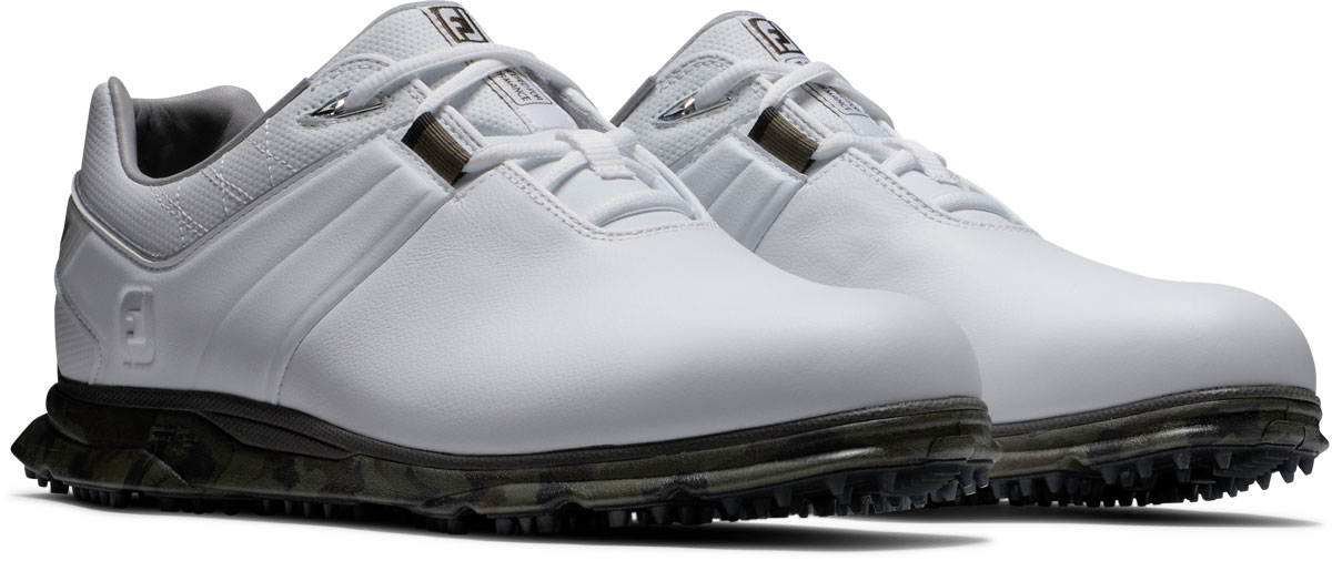 FootJoy Pro SL Spikeless Golf Shoes feature signature premium construction, with StratoFoam cushioning system and durable, leather uppers, now with stylish camo print outsoles for added flair.