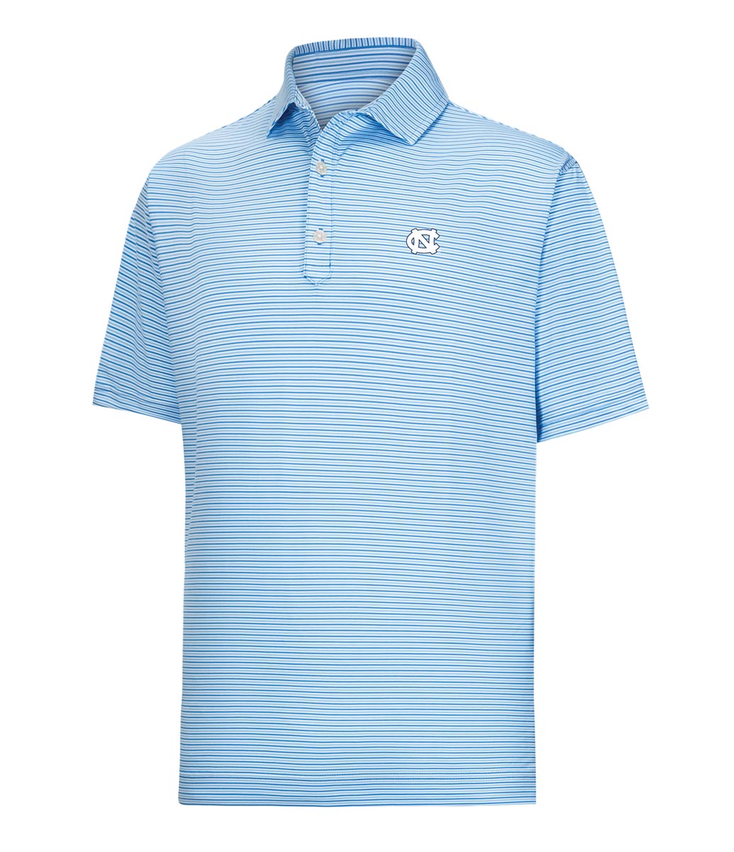 FootJoy Smooth Stripe Lisle Golf Shirts are constructed with 88% Polyester, 12% Elastane, a smooth stripe design, a 3-button placket, and the University of North Carolina logo.