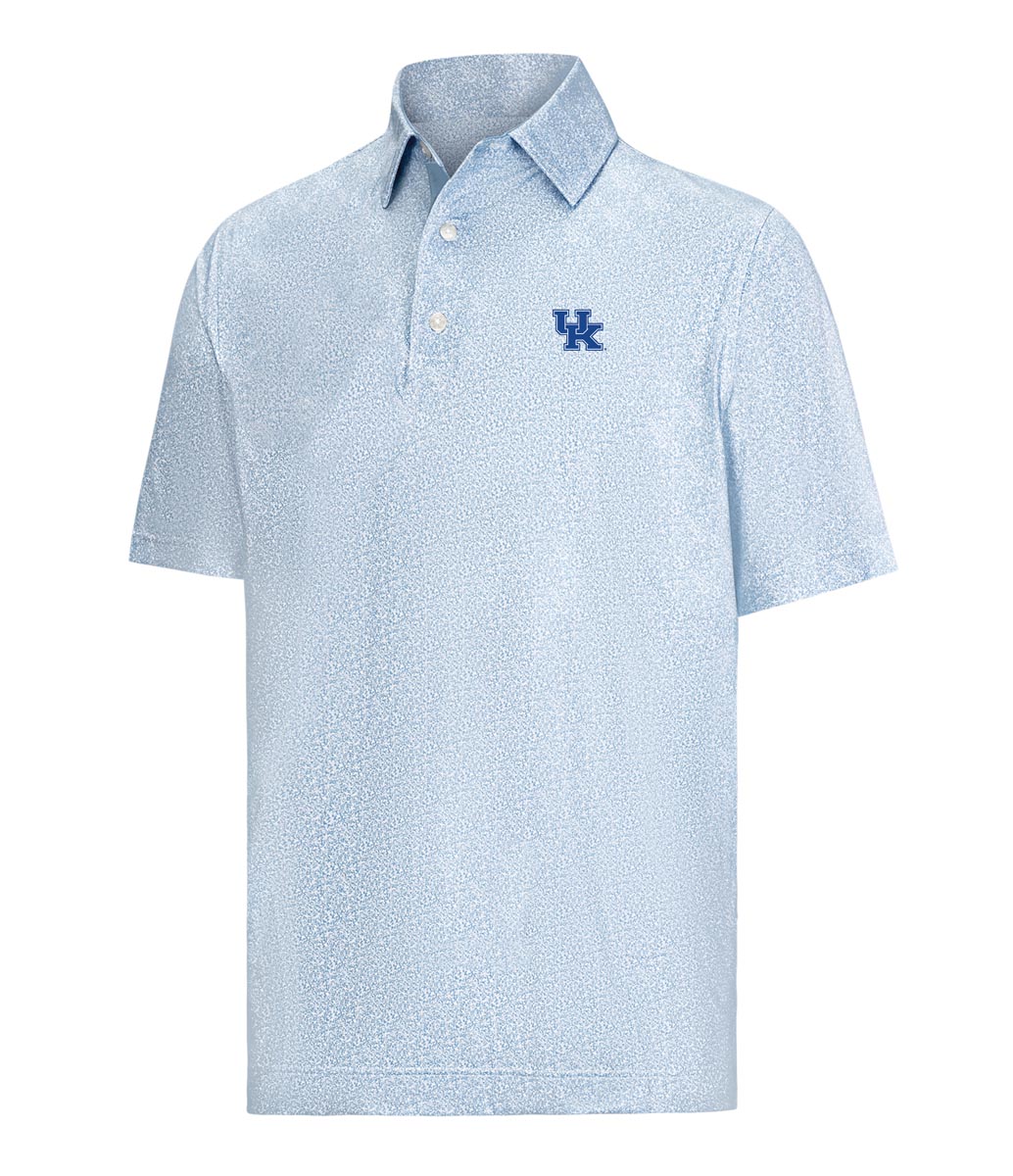 FootJoy Speckle Lisle Print Golf Shirts are constructed with 88% Polyester, 12% Elastane, a 3-button placket, a subtle speckle print, and the University of Kentucky logo.