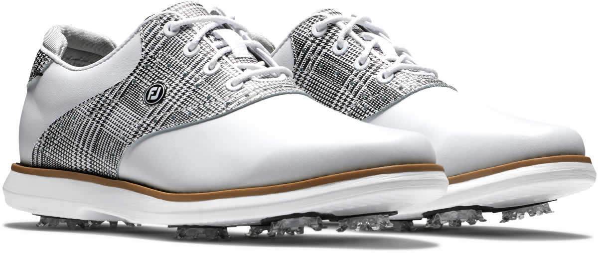 FootJoy Traditions Women's Golf Shoes - Previous Season Style - White smooth leather with grey plaid saddle, natural welt and white sole