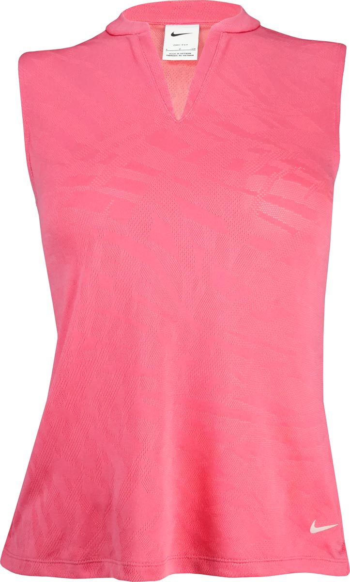 Nike Women's Dri-FIT Victory Jacquard Sleeveless Golf Shirts feature an animal print-inspired pattern that is knit into breathable, sweat-wicking fabric so it won't impact breathability or stretch.