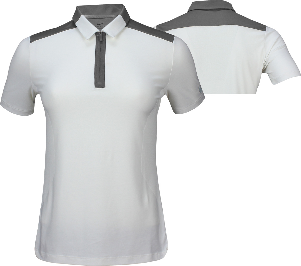 These Nike Women's Dri-FIT Zonal Cooling Statement golf shirts are designed with a zippered placket, self-fabric collar and Nike Swoosh logo at the left sleeve.