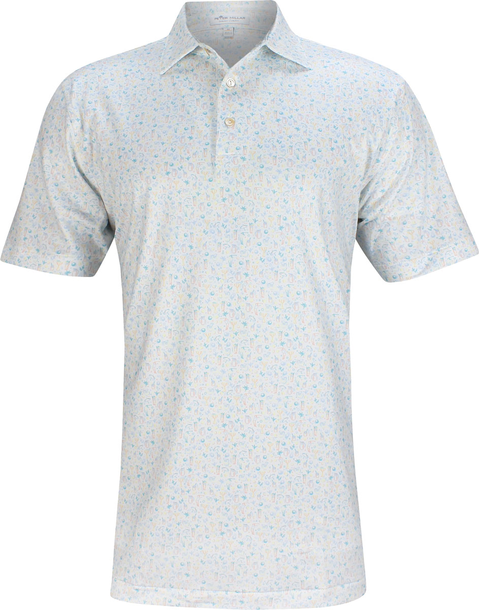 Peter Millar Half & Half Performance Jersey Golf Shirts - ON SALE - White with golf and cocktail print