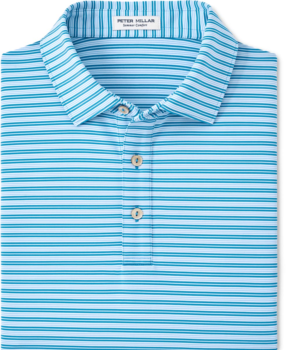 Peter Millar Hamden Performance Jersey Golf Shirts are constructed with 92% Polyester, 8% Spandex, three-button placket, self collar, and a tri-color stripe design.