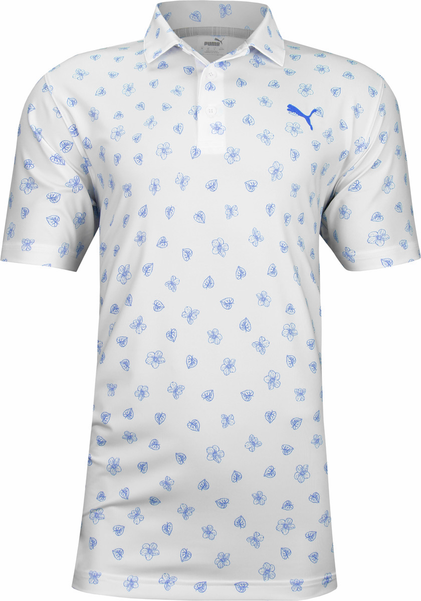 Puma MATTR Spring Golf Shirtsa are constructed with 92% Recycled Polyester, 8% Elastane Single Jersey, three-button placket, UV resistant 40+ UPF, self collar, and subtle floral print.