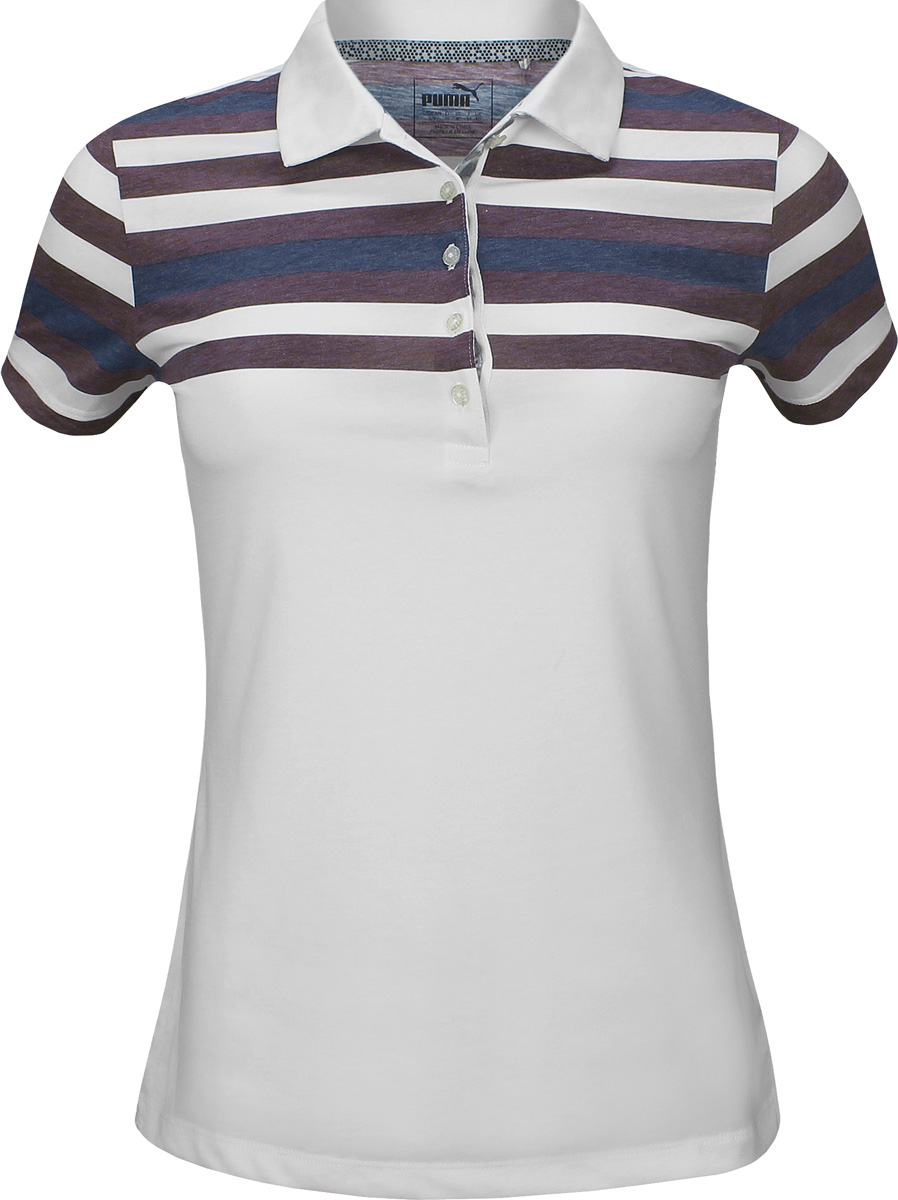 Puma Women's DryCELL Road Map Golf Shirts feature moisture wicking fabric and a multi-color stripe print for fun and flirty style out on the links.