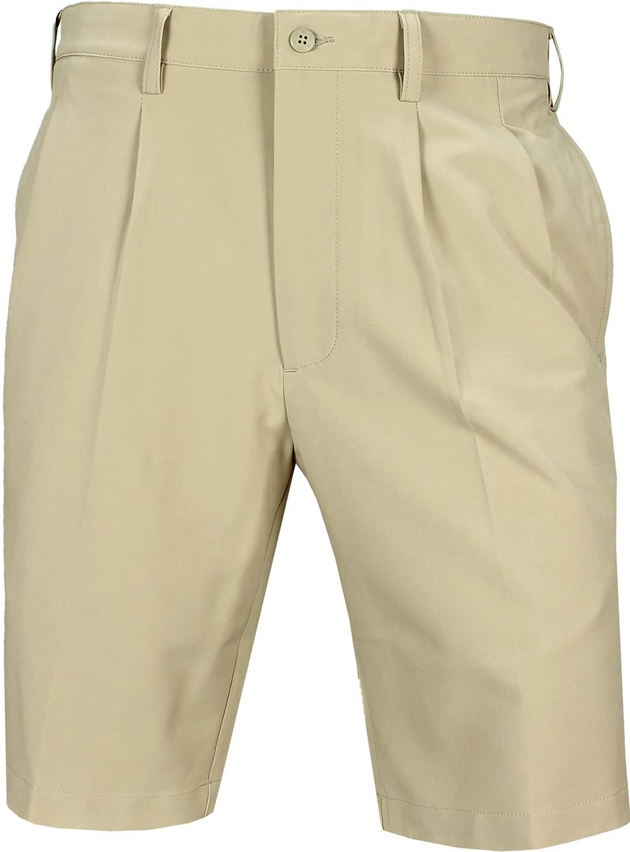 Featuring 88% Polyester, 12% Spandex fabric in a single pleat construction with two front pockets and two back pockets, these golf shorts provide a great fit with ample storage space.