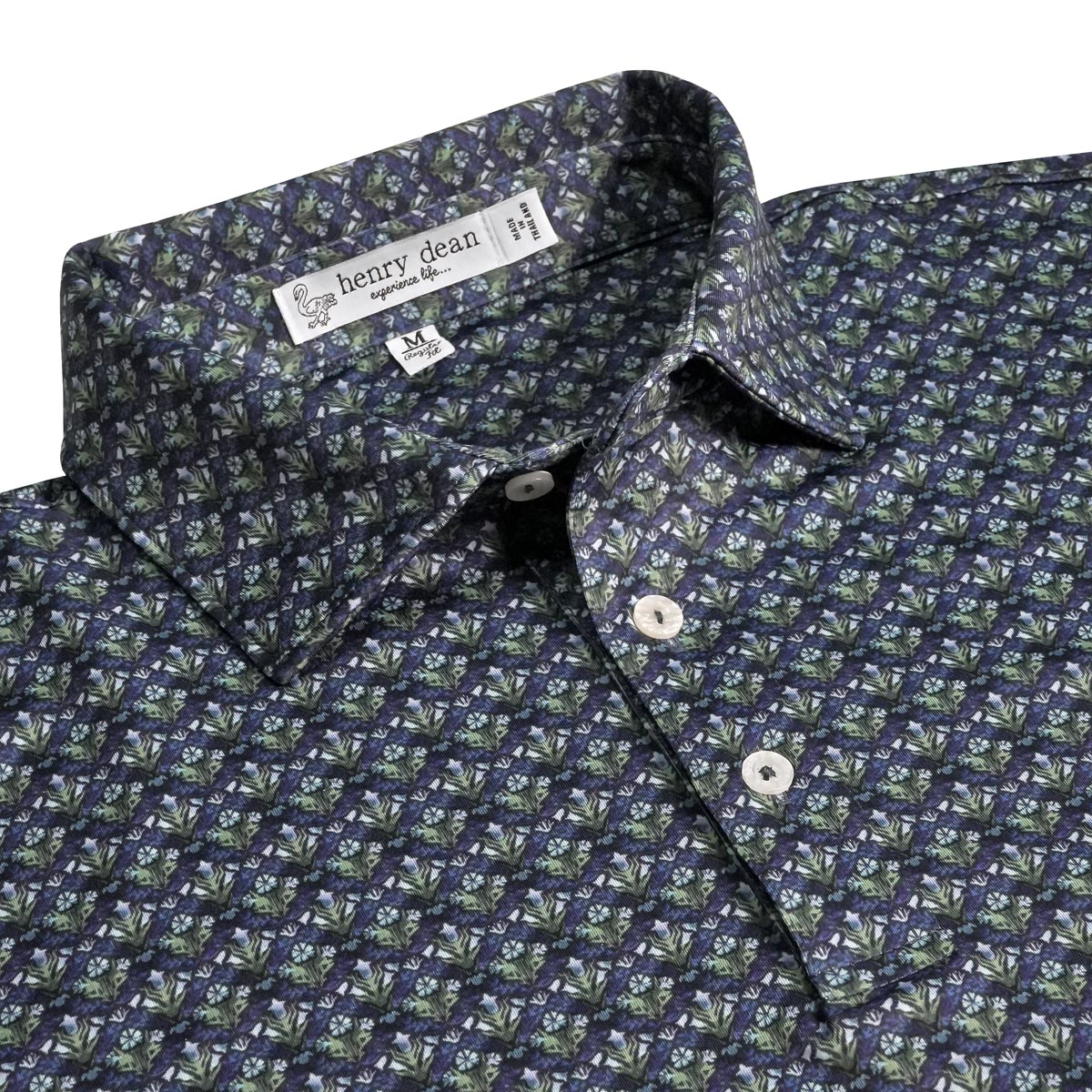 henry dean Floral Geo Print Performance Knit Golf Shirts are constructed with 90% Polyester, 10% Spandex, three-button placket, self collar, and a floral geo print.