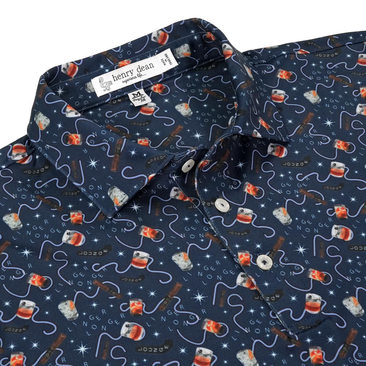 henry dean Linger Longer Print Performance Knit Golf Shirts is inspired by one of the best locker room lounges in golf, provided by a very special man. If you ever get the opportunity to linger, you'll want to stay longer with a "perfect Manhattan".