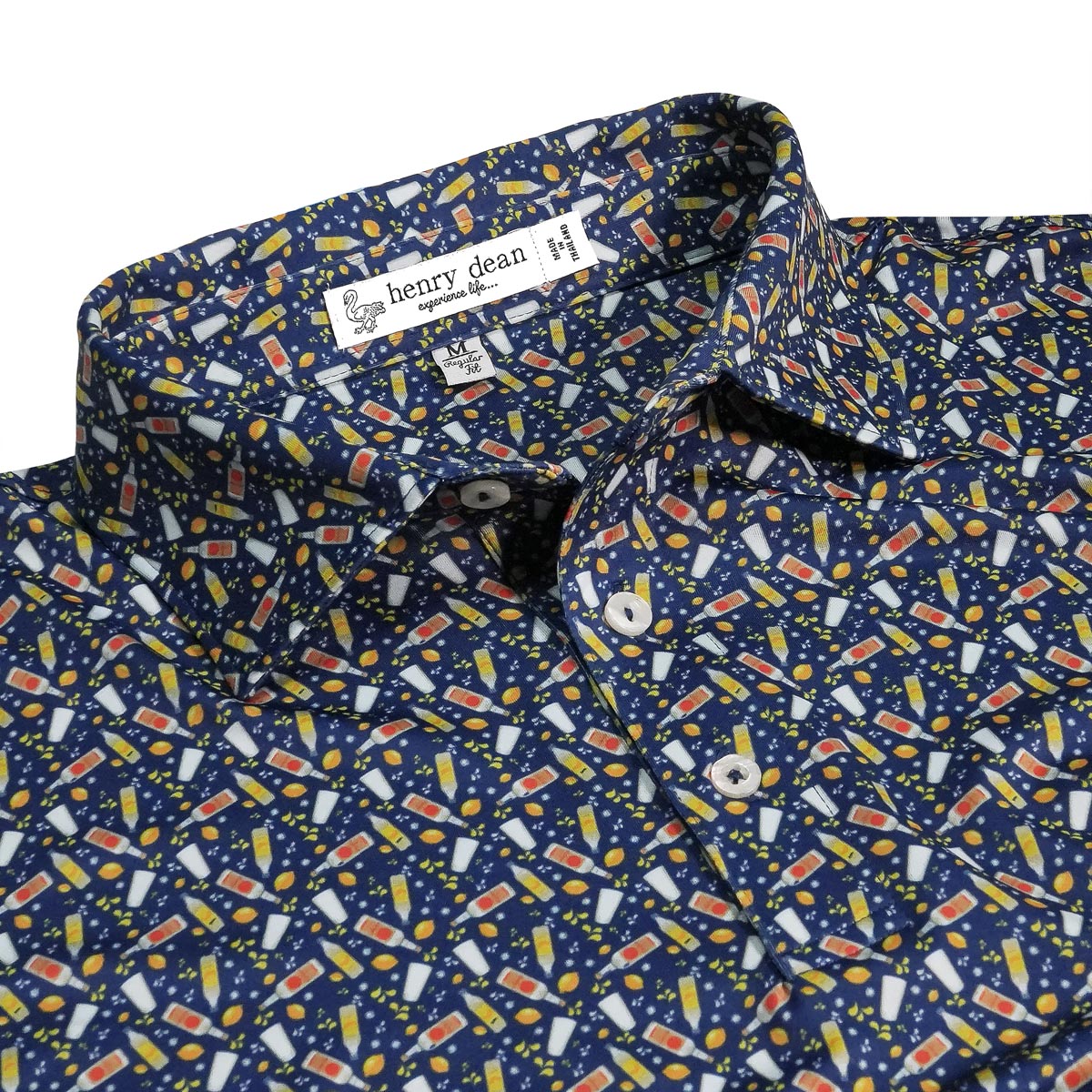 henry dean Manning Print Performance Knit Golf Shirts are constructed with 90% Polyester, 10% Spandex, three-button placket, self collar, and a novelty drink print.