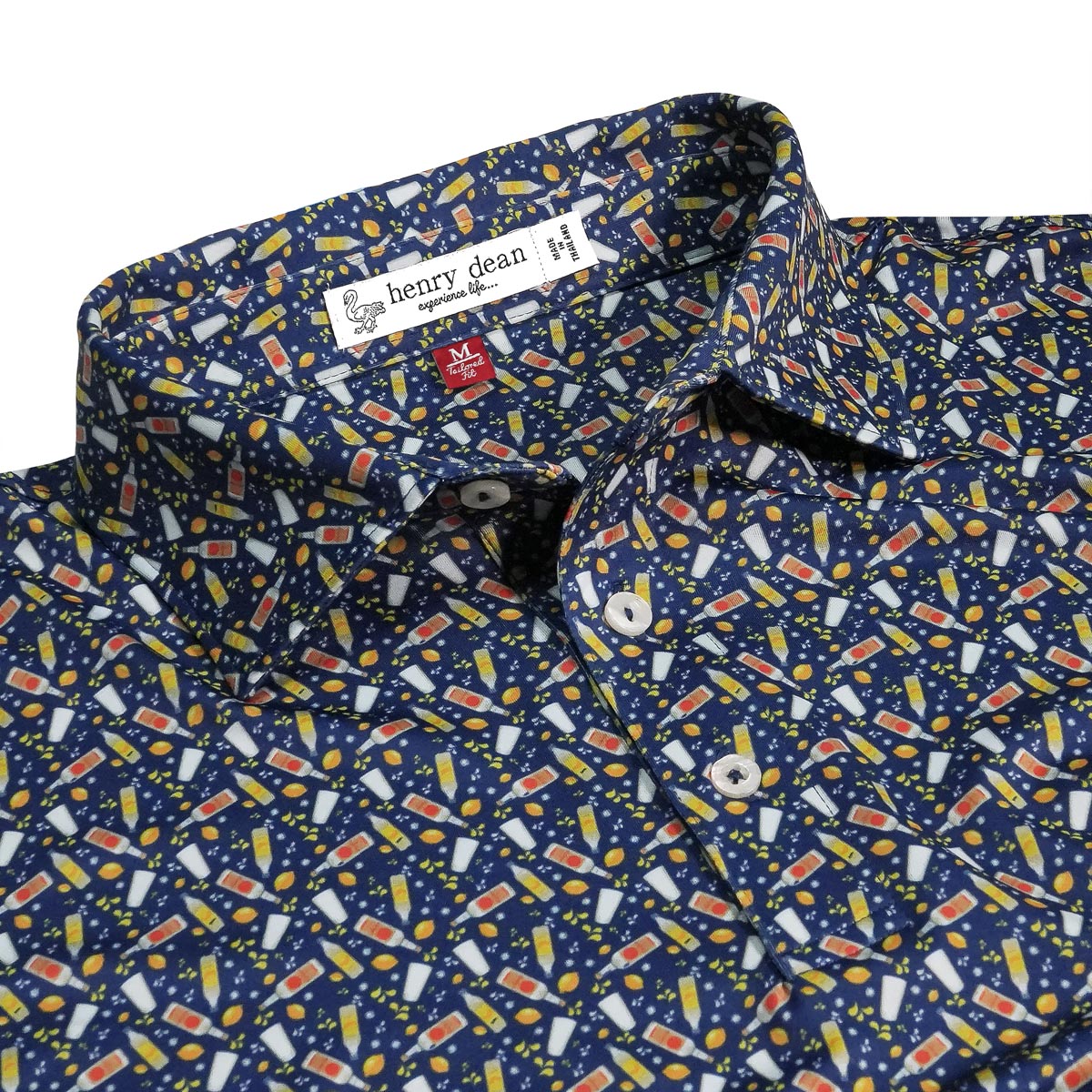 henry dean Manning Print Performance Knit Golf Shirts are constructed with 90% Polyester, 10% Spandex, three-button placket, self collar, and a novelty drink print.