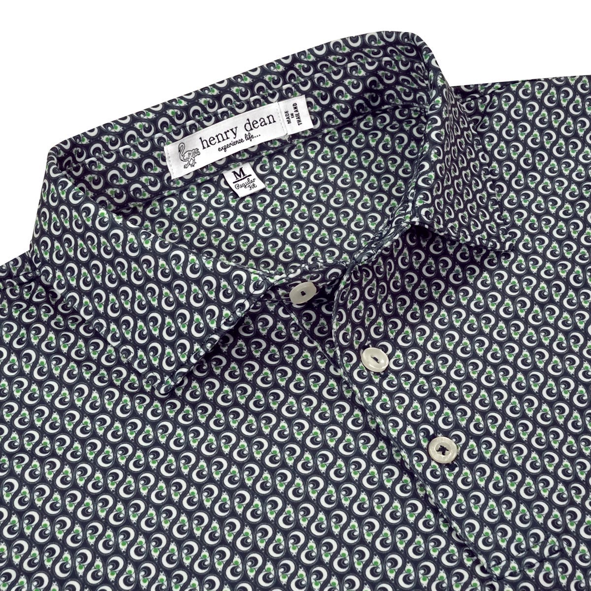henry dean Paisley Cup Print Performance Knit Golf Shirts are constructed with 90% Polyester, 10% Spandex, three-button placket, self collar, and a paisley print.